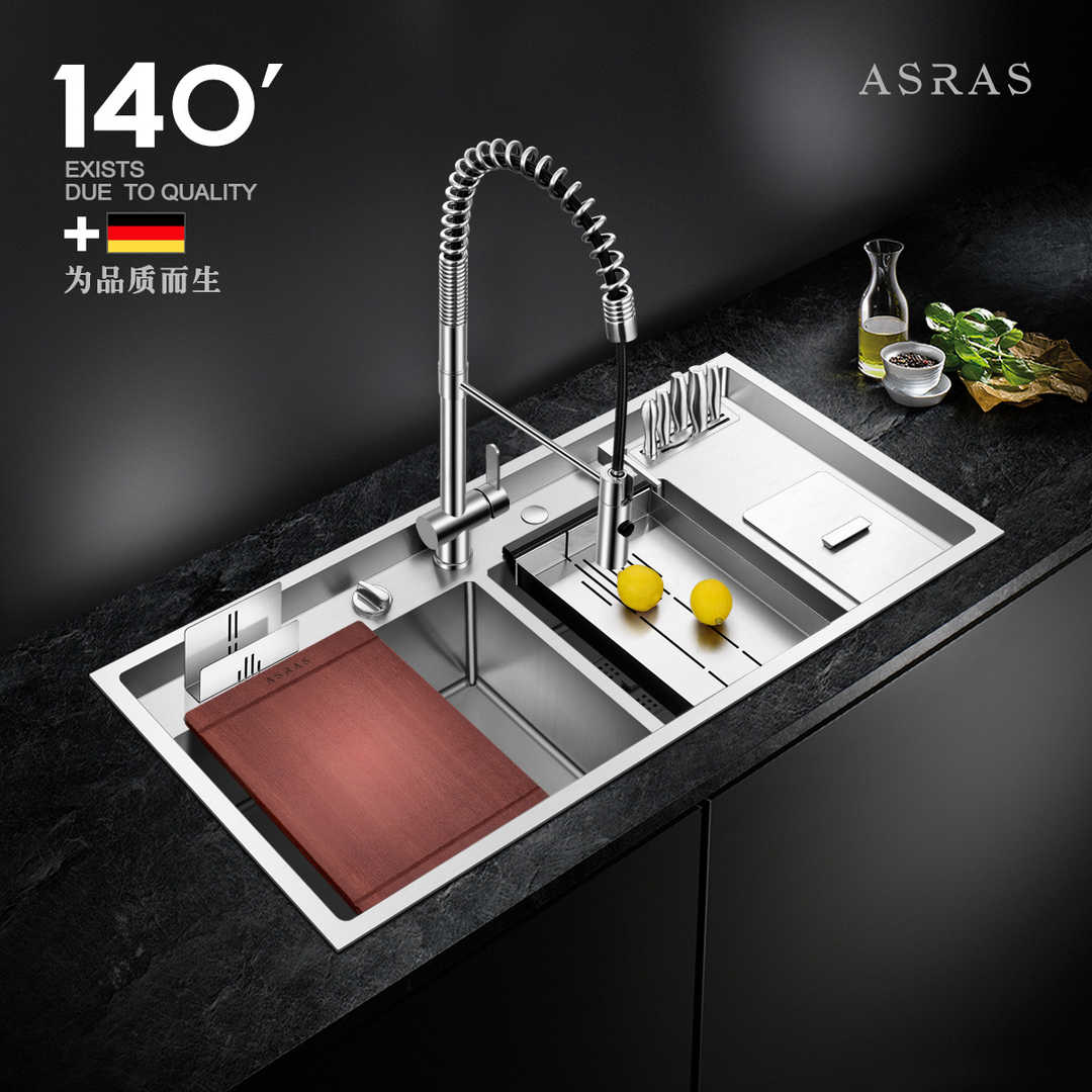 阿萨斯大型304不锈钢厨房手工水槽双槽洗菜盆套餐带垃圾桶加厚